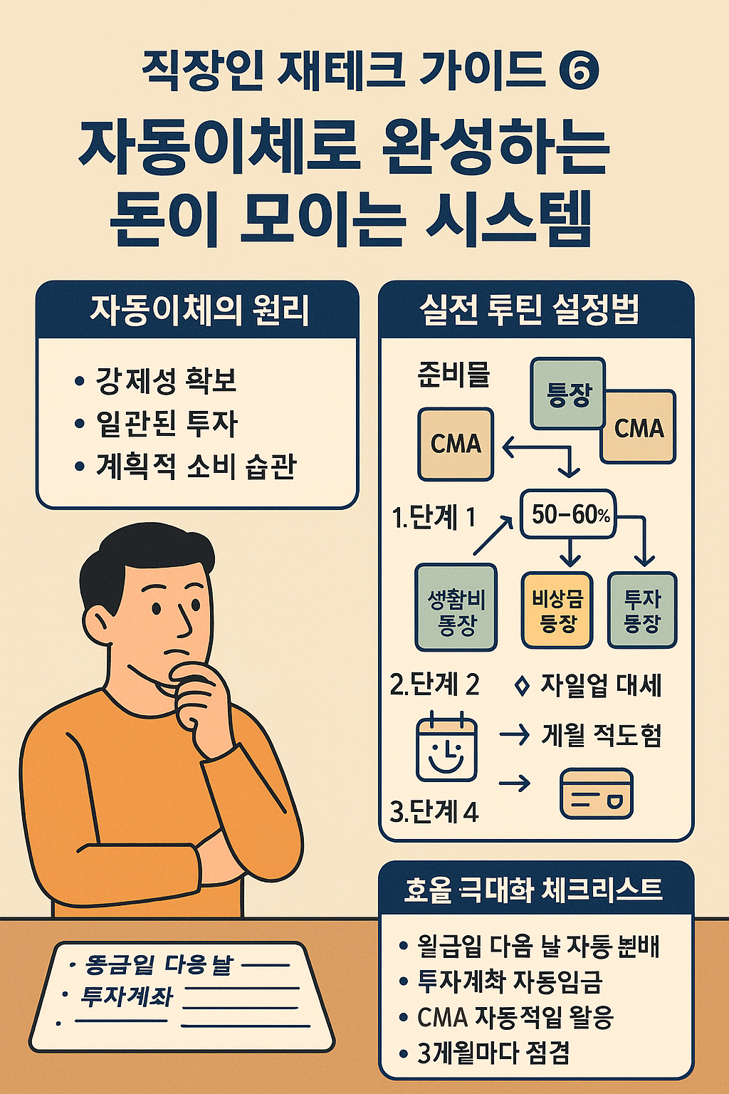 의지가 아니라 시스템으로 돈을 모으세요. 자동이체는 직장인이 가장 쉽게 실천할 수 있는 재테크 루틴입니다.
